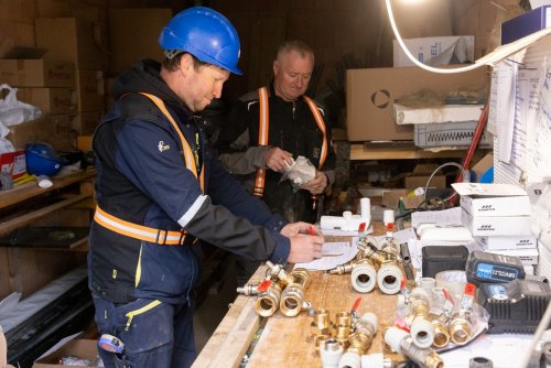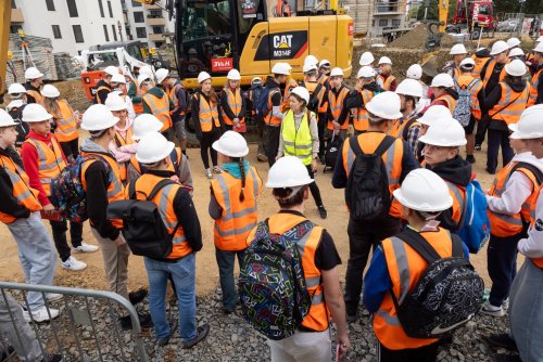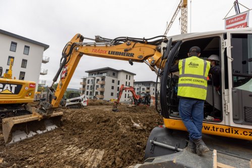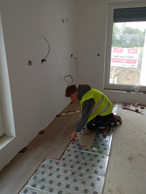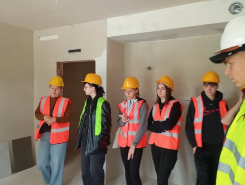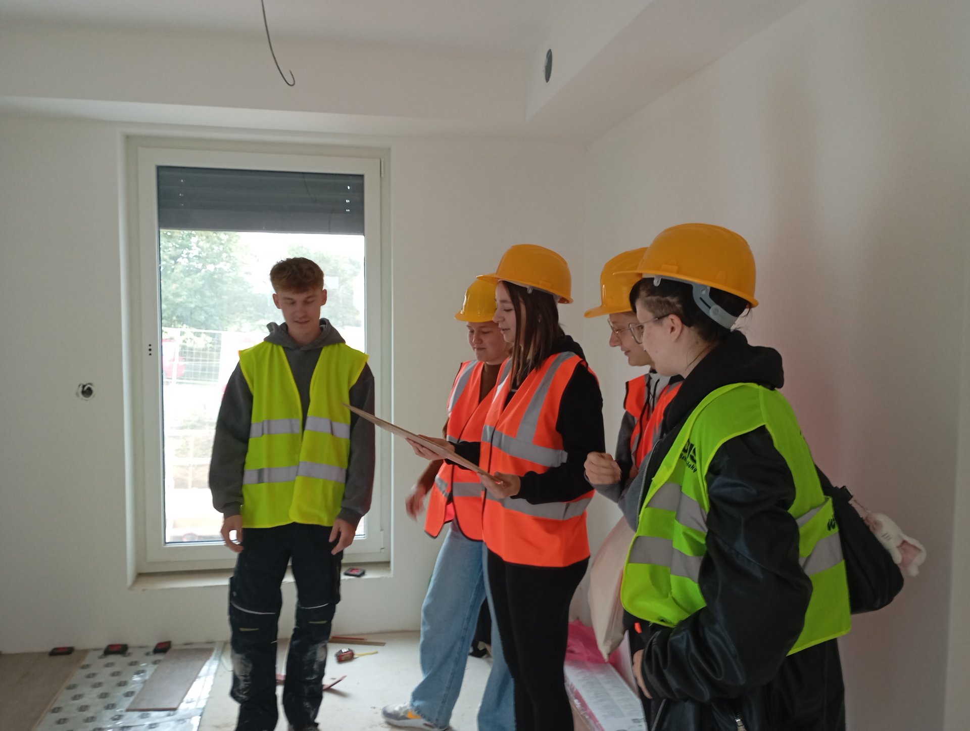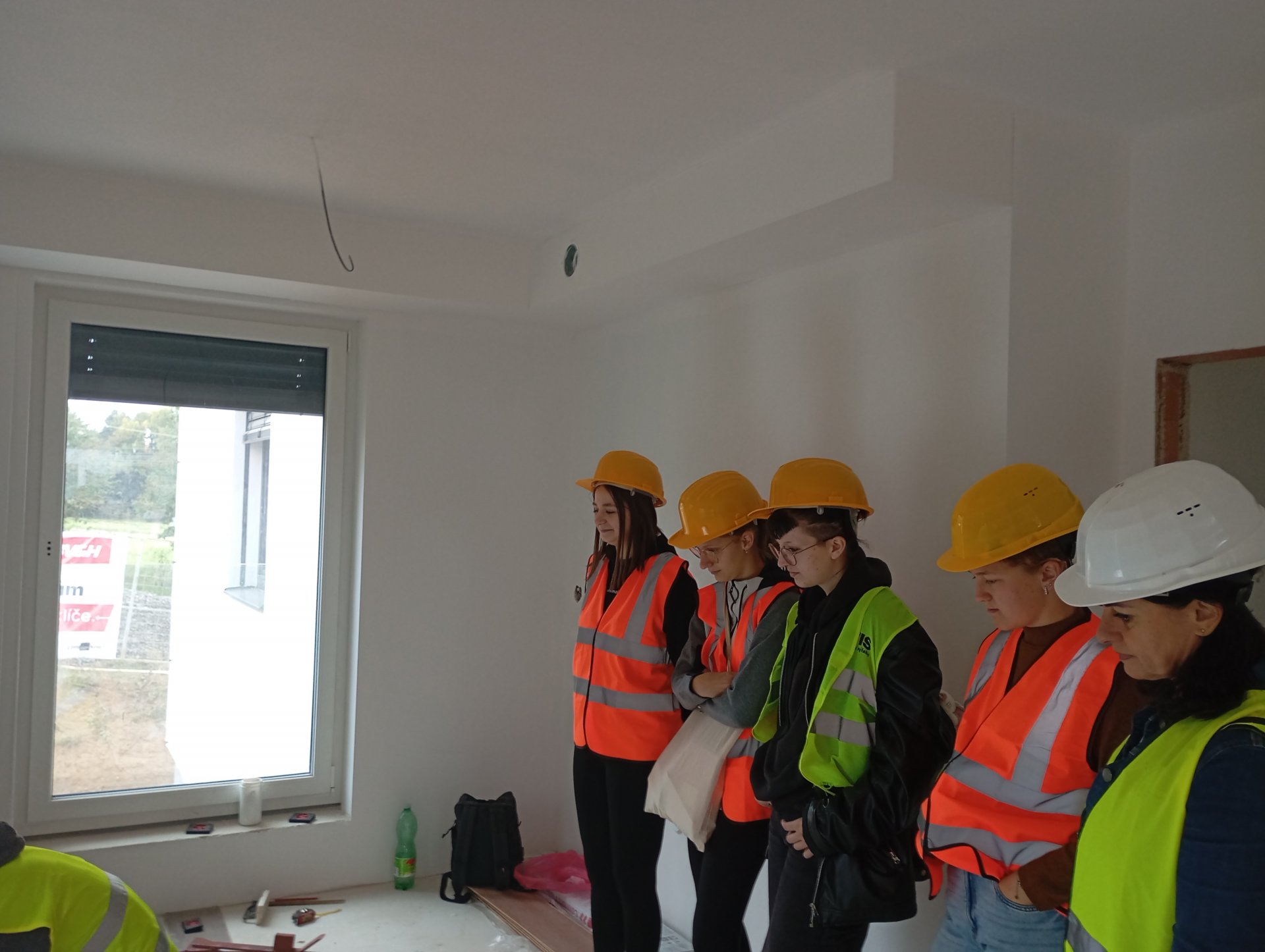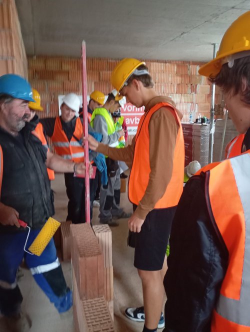 ročníku oboru stavebnictví. Na exkurzi si žáci mohli projít objekty v různých fázích výstavby. Od provedení zaměření a vytyčení objektu i prostřednictvím dronové technologie až po prohlídku hotového typového bytu s ukázkou dokončovacích prací, jako bylo pokládání podlah a omítání. Žáci si mnoho z prací na exkurzi mohli sami vyzkoušet.