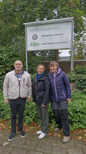 A tak to bylo také na naší partnerské škole v německém Tönisvorstu. S touto školou jsme dlouho spojeni nejen skrze výměnné pobyty našich žáků, ale také díky partnerství mezi městy Staré Město a Tönisvorst. V pondělí 22. září 2025 nás přivítala ředitelka Michael Ende Gymnázia Nicole de Bruyn, se kterou jsme probírali výhody Erasmu pro studenty a pedagogy, ale i to, co nás čeká. Poté nás představila svému kolegiu (tedy pedagogickému sboru). Němečtí kolegové mají společnou sborovnu, kterou sdílí všichni společně. Jejich pracovní místa jsou malá, skládají se jen ze stolu a židle a nikde nevidíte nějaké sešity, učebnice atd.